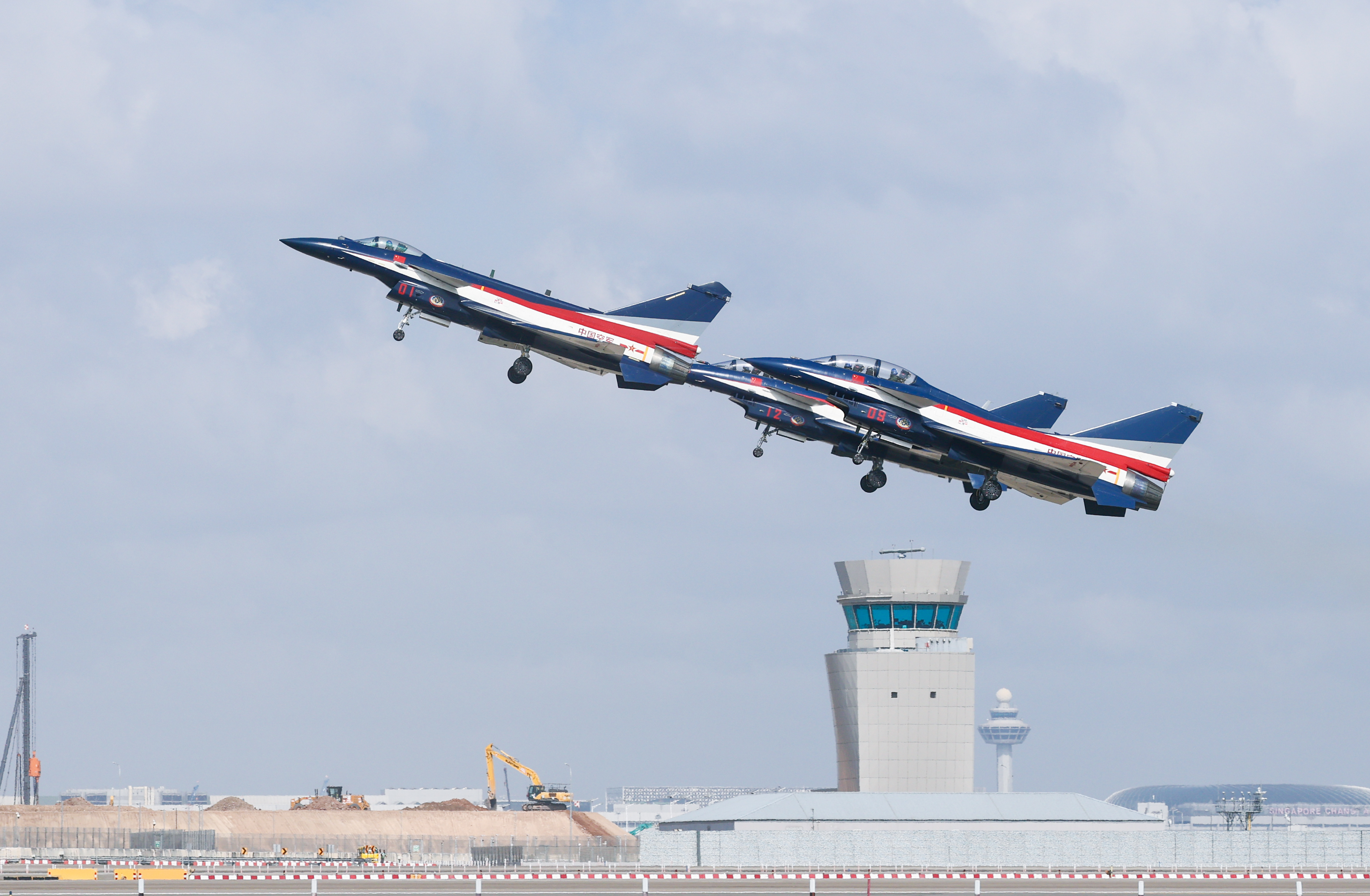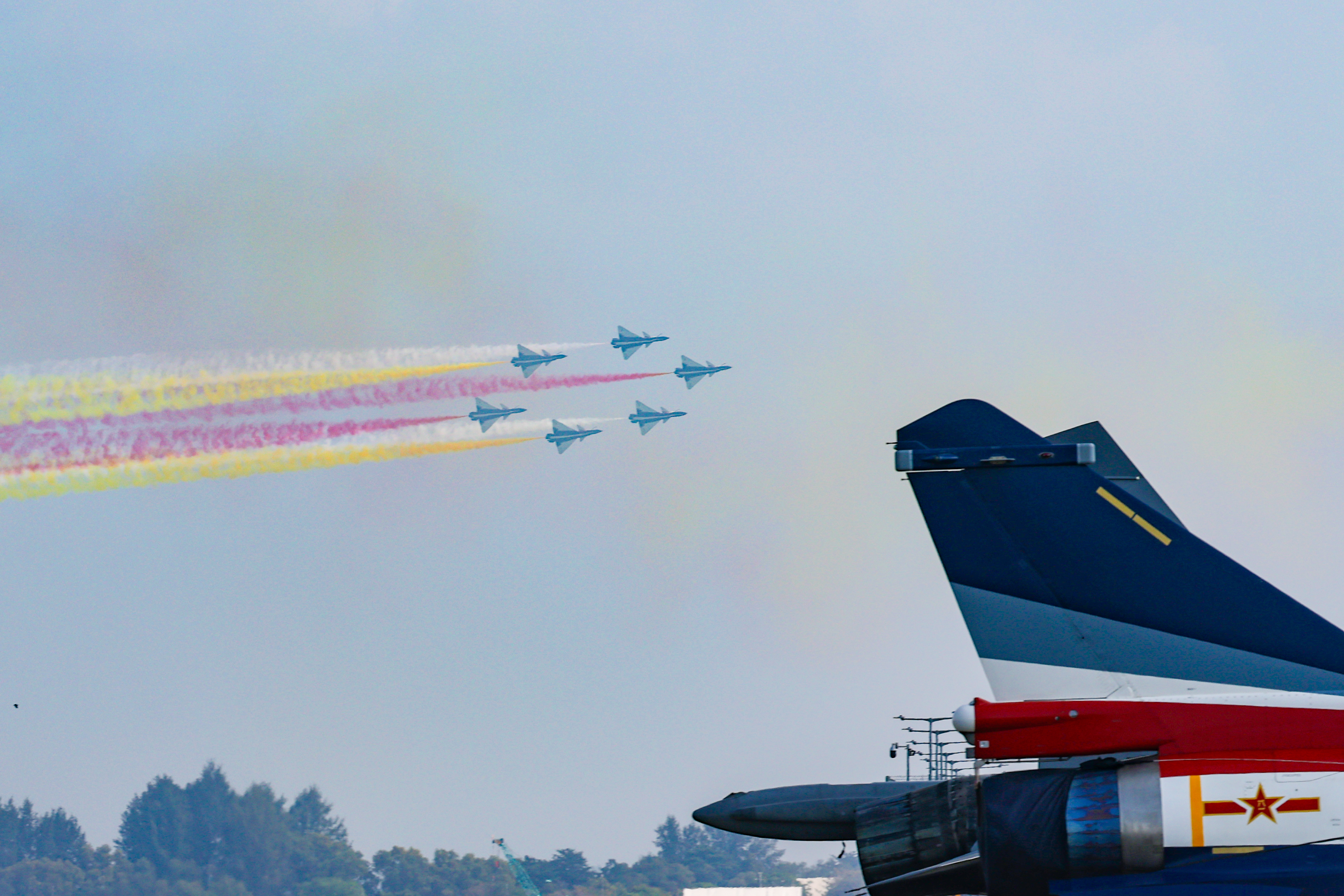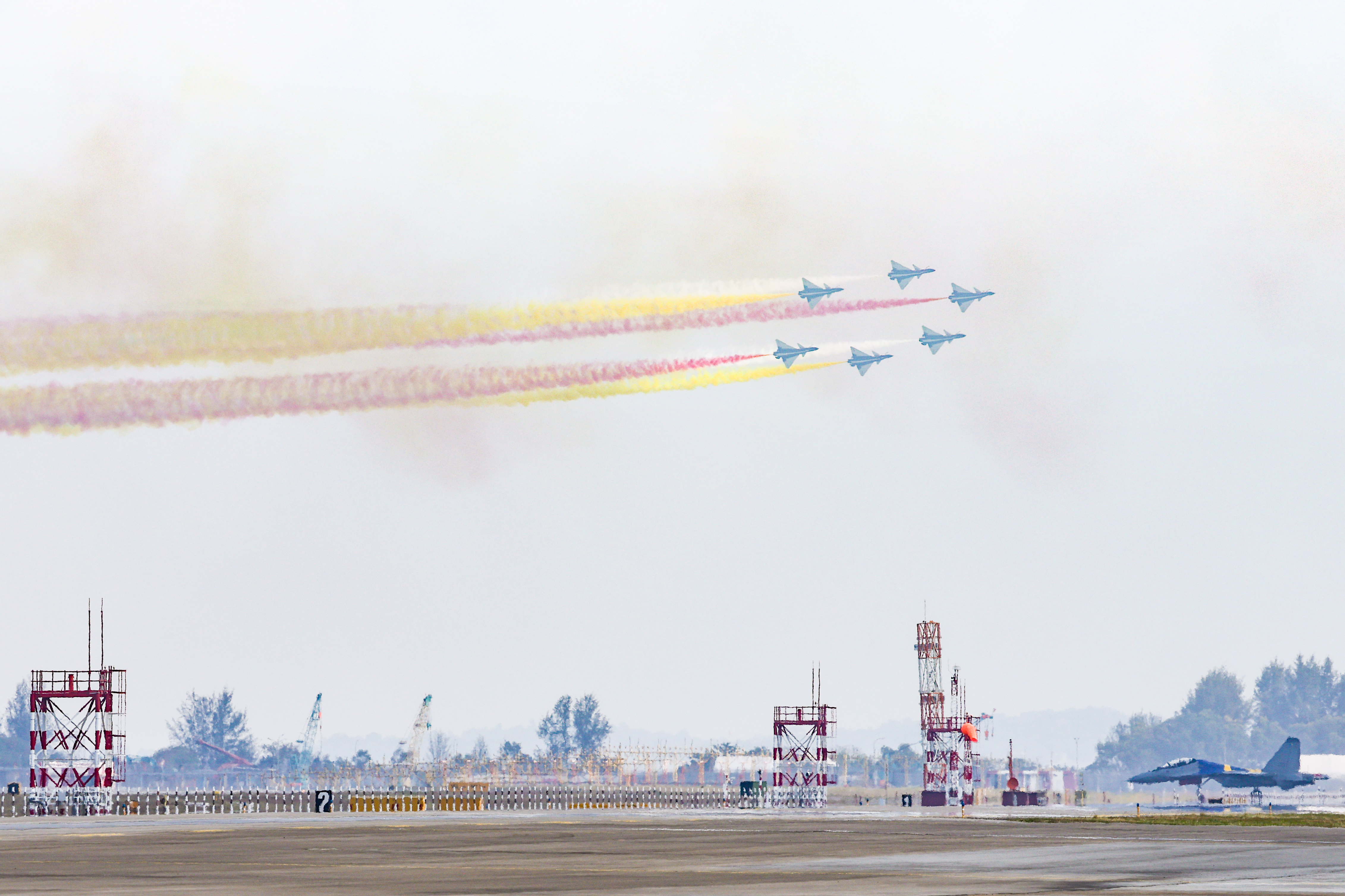 “cleared for takeoff(允许升起)”,接到塔台升起教唆后,6架歼-10扮演机在云底高600米的要求下,分2批快速滑跑升起,伴跟着渊博轰鸣声冲向天空,在空中完成集结编组后,就地飞往机场隔壁海面上空。