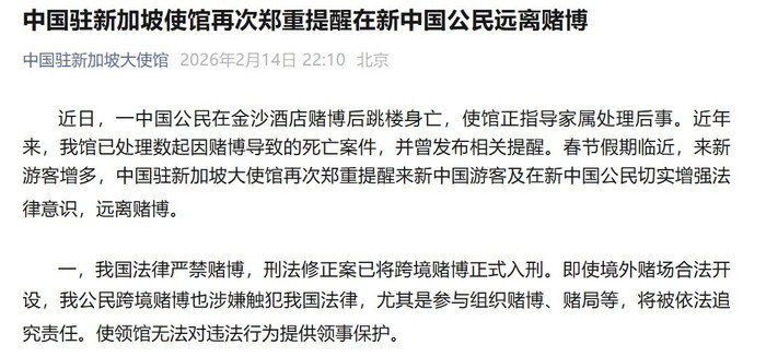 据央视新闻,2月14日,中国驻新加坡使馆再次珍惜指示在新中国公民鉴识赌博。全文如下: