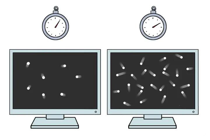 反之,要是咱们想要精准测量光点的速率,就必须蔓延代码的运行时期——运行时期越长,光点的残像拖影就越彰着,咱们对速率的判断就越精准。但与此同期,光点闪耀的位置就会越来越多,临了屏幕上光点留住的踪迹,会变成一团涔涔一样,连接地散开,咱们对它位置的细则性领路,天然就会越来越不精准。