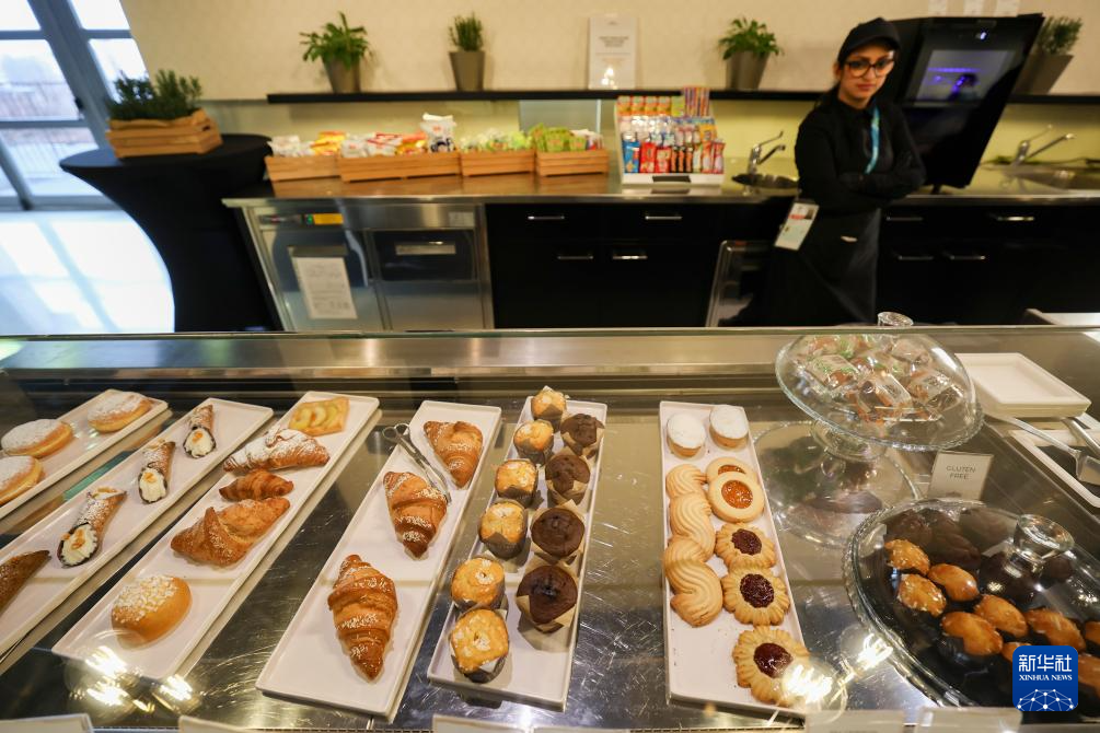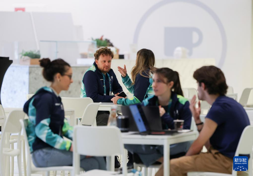 1月28日,责任主说念主员在主媒体中心餐厅区域休息、换取。