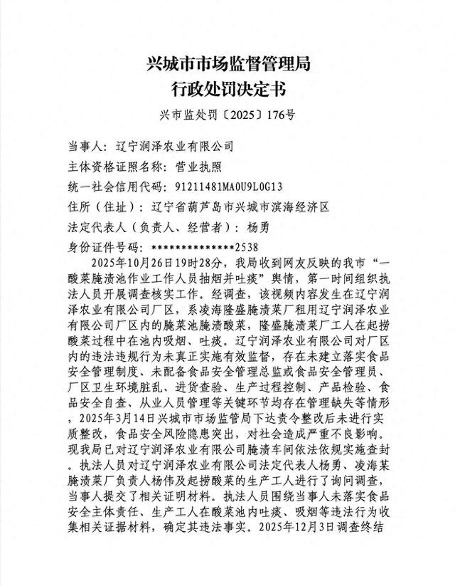 【公共网详尽报说念】客岁10月,工东说念主在酸菜腌渍池内抽烟、吐痰的恶劣事件激发全网热议,关系食物安全问题备受热心。近日,国度企业信用信息公示系统公开的行政处罚决定书,败露了该事件的最终处理成果。