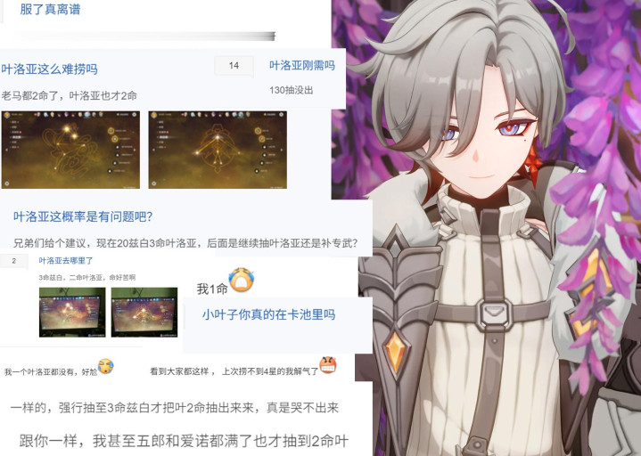 也有玩家表示兹白池抽了100发一个叶洛亚都没有,甚至还看到不少打算抽满命小叶子的玩家,其实说实话叶洛亚有个两命就够了,4命蚊子腿加强,6命的10暴30爆伤也就那样,带穹境套又不缺暴击,轮盘游戏app后续还有5星上位要来,没必要非执着满命。