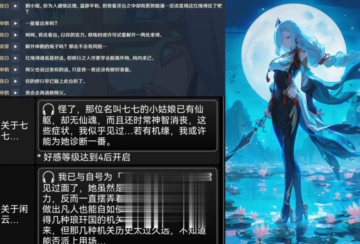 最后也给大家说的就是璃月老角色加强真的要来了,在兹白的剧情中提前预告了接下来会对七七,申鹤以及闲云这三位角色的加强剧情。其中申鹤是解开一部分红绳封印,给闲云一些葬火前的机关术,以及治好了七七的后遗症。