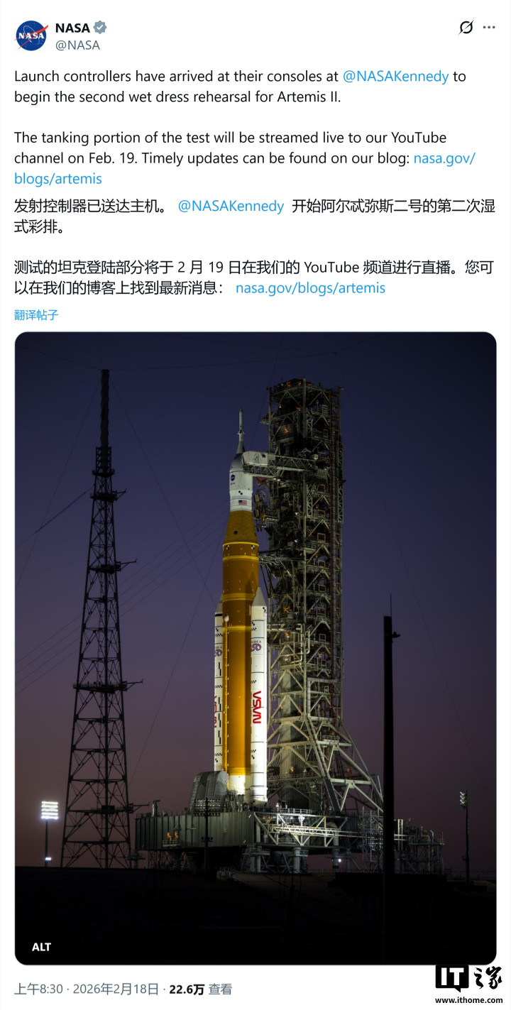IT之家2月18日音书,科技媒体Space今天(2月18日)发布博文,报说念称好意思国宇航局洽商未来(2月19日周四)对阿耳忒弥斯2号(Artemis2)月球火箭实验要害的第二次“湿彩排”测试。