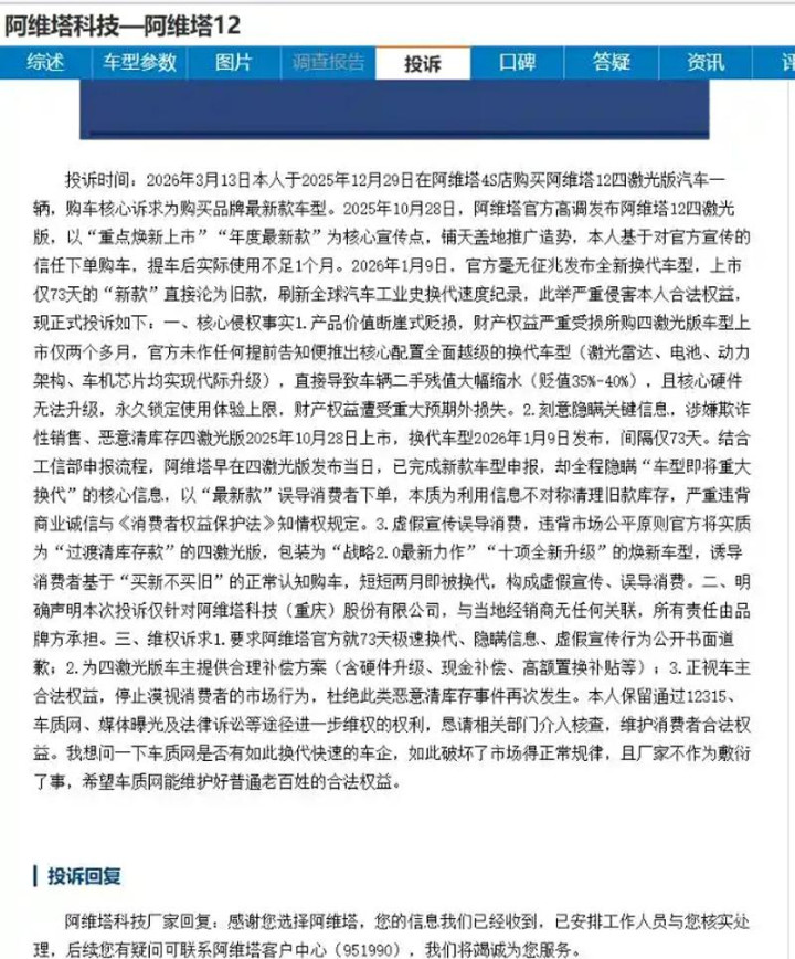 从四激光版上市到新款预报,休止仅73天。普遍老车主在酬酢考取三方投诉平台发声,控诉阿维塔 “73天急速迭代+信息守密+硬件代差+无补偿”。车主称,阿维塔明知将推紧要换代车型,却在销售四激光版时刻意守密,借 “2026 款”绮丽误导滥用者,借年末购车旺季清库存,导致所购车辆短期内大幅贬值,二手车估值缩水数万元,侵害滥用者知情权与公说念往复权。