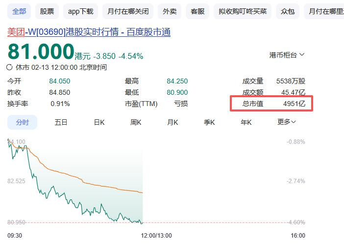 截止2026年2月13日午盘,好意思团-W股价在81港元隔邻踟蹰,盘中最低波及80.9港元,刷新往常52周最低记录;当日成交量达5538万,成交额45.47亿港元,总市值报约4951亿港元,崇拜跌破5000亿港元整数关隘。回思2025年事首,好意思团股价尚在百港元之上,彼时市值朝上6000亿港元,如今不到一年半光景,市值已挥发逾1200亿港元。