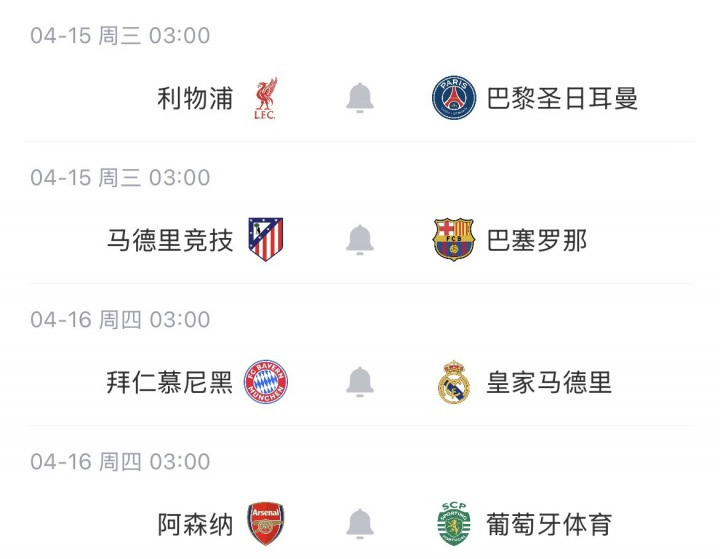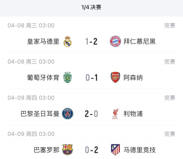 次回合将于4月15/16日进行,利物浦、马竞、拜温柔阿森纳主场作战。