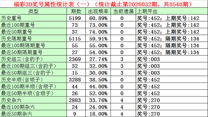 福彩3D上期奖号为452,上期开出重号42。最近100期重号开出73期,开出比例73%,最近50期重号开出37期,开出比例74%,最近10期重号开出 8期,出现比例为80%,本期细心重号出现。