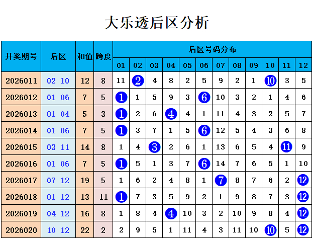 上期转头:大乐透第2026020期奖号为:前区01、10、21、23、29,后区10、12,前区奖号012路比为1:2:2,奇偶比为4:1,后区开出1路、0路组合10、12
