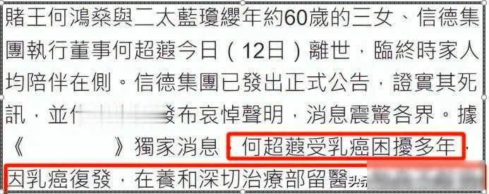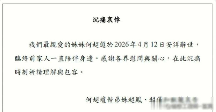 4月12日,何超蕸在澳门死一火,她59岁,得的是乳腺癌,旧年11月还公开出头,看着挺精神,其实病情照旧复发,仅仅她没说,杨千嬅前几天开演唱会,三次哭到说不出话,其时公共以为是歌太感东说念主,当今才知说念那是她临了的告别。