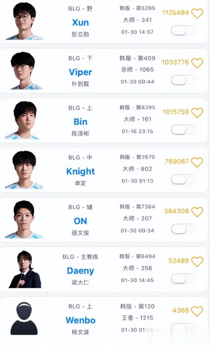 先说Rank,对职业选手而言,Rank早就不是单纯的“排位上分”,而是保持手感、理解版本、验证细节的最低成本方式,你可以不把Rank当全部,但你不能长期不打,现在的情况是,1月30号其他选手都有Rank记录,唯独Bin的Rank还停在16号,整整半个月空窗期,这在赛季中段几乎是不可想象的,尤其是上单这个位置,版本理解、对线细节、英雄熟练度更新速度都极快,一旦脱节,比赛里就会被无限放大。
