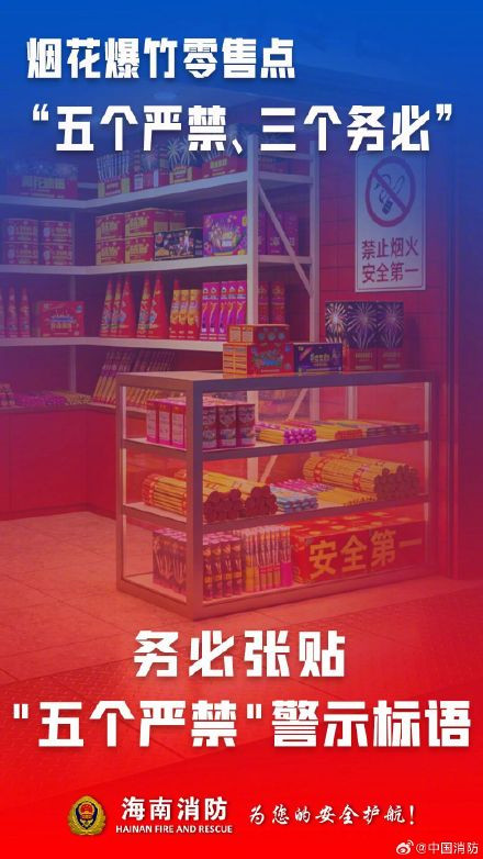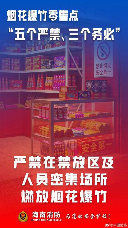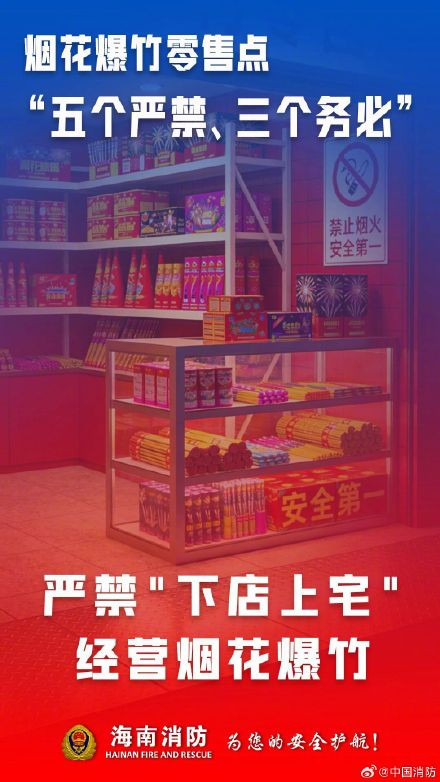 严禁下店上宅谋划烟花炮竹,严禁超量储存,严禁将居品摆放至店外,可提现游戏平台严禁在零卖店附进100米内燃放试放,轮盘游戏严禁在禁放区及东谈主员密集所在燃放烟花炮竹;务必专东谈主现场盯守,务必严控进店东谈主数,务必张贴“五个严禁”警示口号。@海南消防